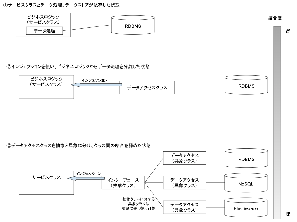 - 他のデータストアを利用することになっても、サービスクラスには変更を加えることなく差し替えが可能。